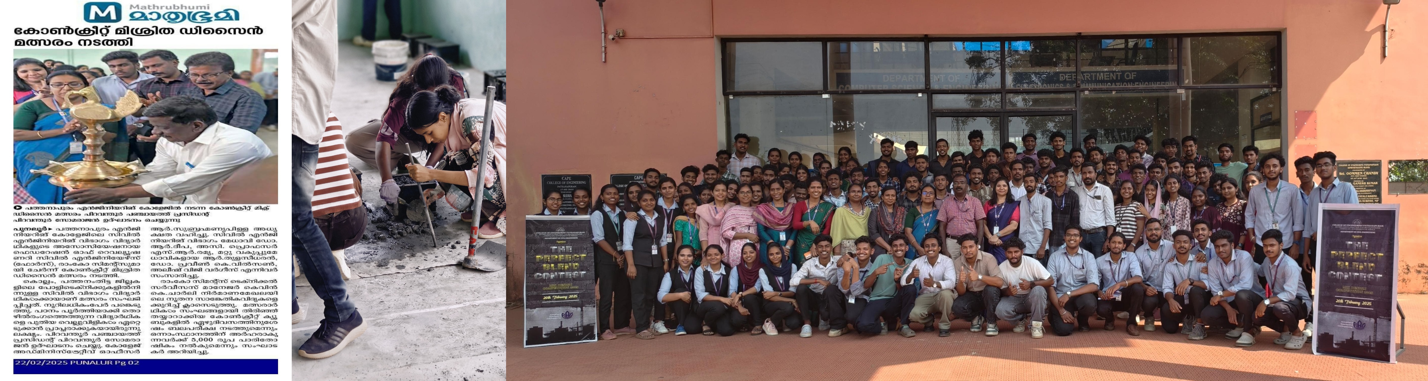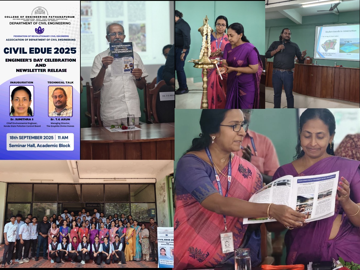 The Department of Civil Engineering, College of Engineering Pathanapuram, organized Civil EDUE 2025 on 18th September 2025 as part of Engineer’s Day celebrations. The event was inaugurated by Er. Sumithra S, Chief Environmental Engineer, Kerala State Pollution Control Board followed by the release of the department newsletter.. A technical talk was delivered by Er. T.G Arun, Managing Director, The Graphite Divine Homes. The program provided a platform for students to interact with industry experts and gain valuable insights into sustainable engineering practices.