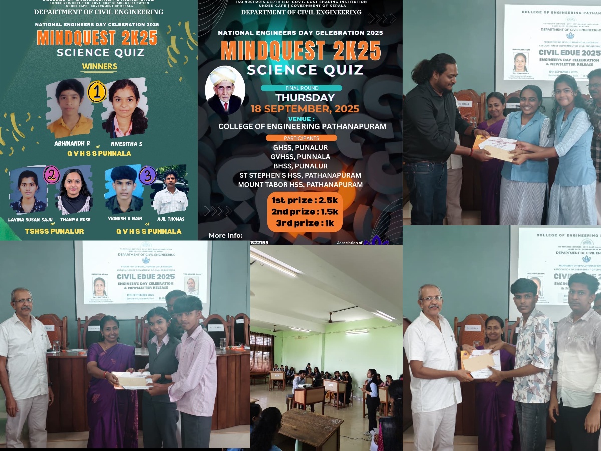 National Engineers’ Day Celebration 2025 – MindQuest 2K25 Science Quiz FORCE, the Association of Department of Civil Engineering, College of Engineering Pathanapuram, proudly organized MindQuest 2K25 – Science Quiz as part of the National Engineers’ Day Celebration 2025 on 18th September 2025. Based on the various rounds of the quiz conducted at schools the final round of the quiz was held at the college campus, with enthusiastic participation from GHSS Punalur, GVHSS Punnala, BHSS Punalur, St. Stephen’s HSS Pathanapuram, Mount Tabor HSS Pathanapuram. Exciting cash prizes were awarded to the winners: 1st Prize – ₹2.5k (GVHSS Punnala) 2nd Prize – ₹1.5k (TSHSS Punalur) 3rd Prize – ₹1k (GVHSS Punnala) The event aimed to ignite curiosity, encourage scientific thinking, and honor the legacy of Sir M. Visvesvaraya, whose vision and contributions to engineering continue to inspire generations.The program witnessed an engaging competition, with students showcasing remarkable knowledge and quick thinking. .